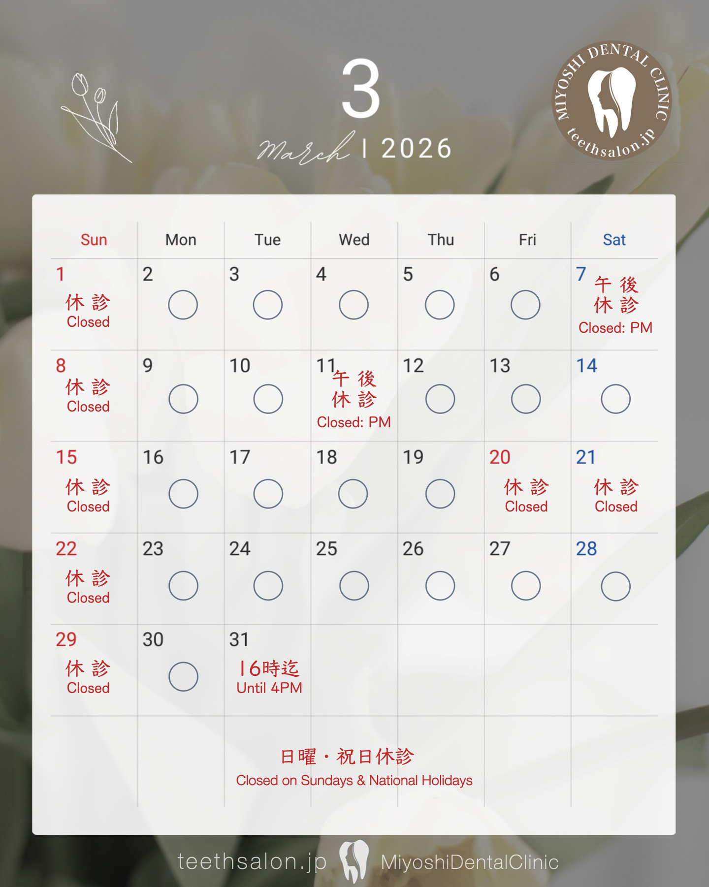 7日(土)、11日(水)は午後休診、21(土)は終日休診です。31日(火)は医療機器点検・清掃・事務作業のため16時までの診療となります。