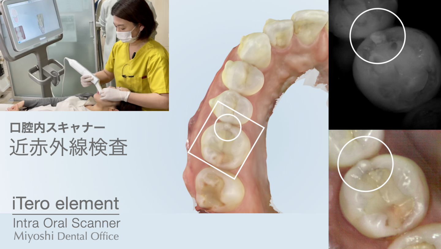 『 iTero element 5D 』は近赤外線の光で、目で見えない部分の虫歯検査が可能です。X線と違い近赤外線の光では虫歯は白く写ります(写真の◯の部分)