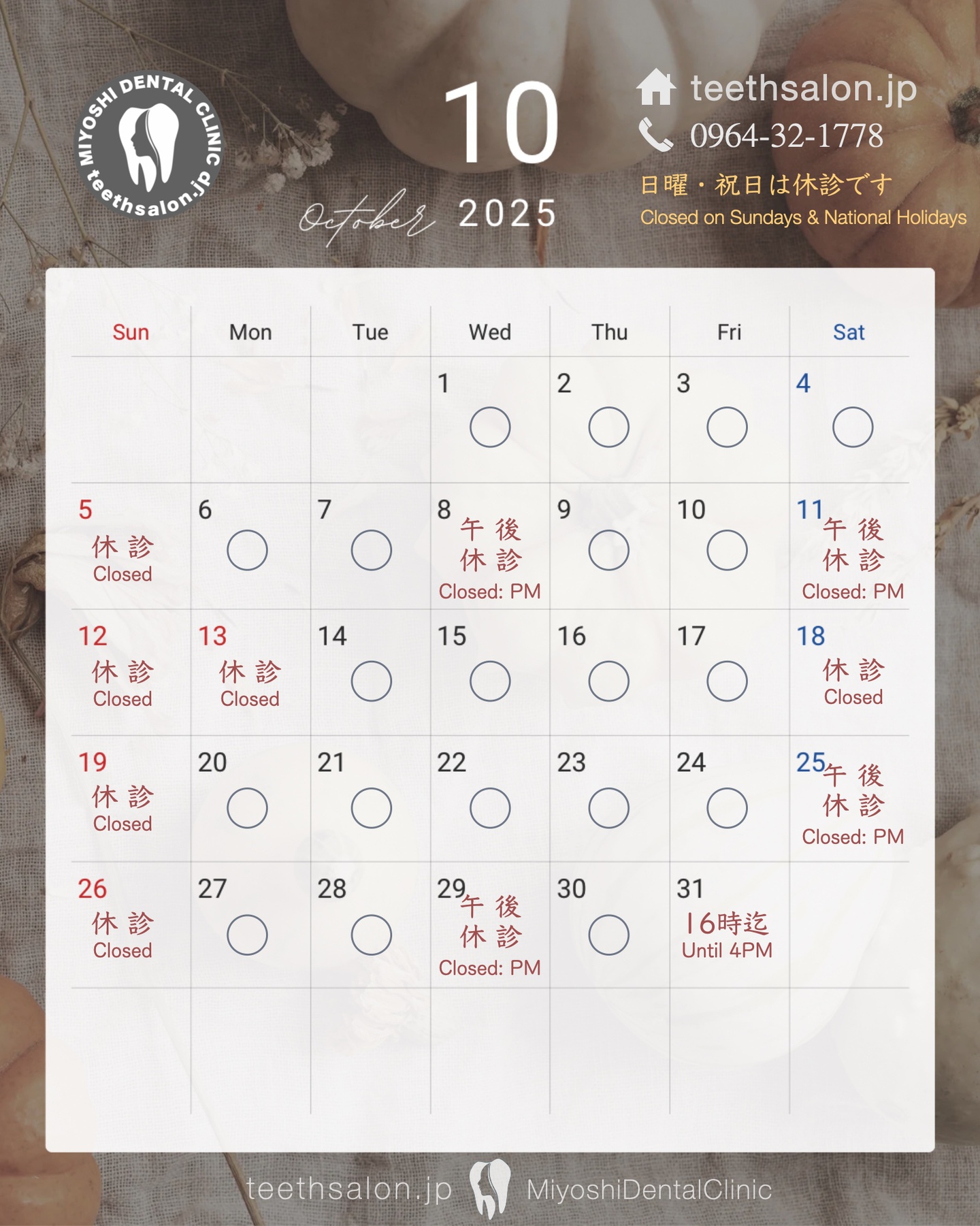 8日(水) ,11日(土),25(土),29(水)は午後休診、18日(土)は休診です。