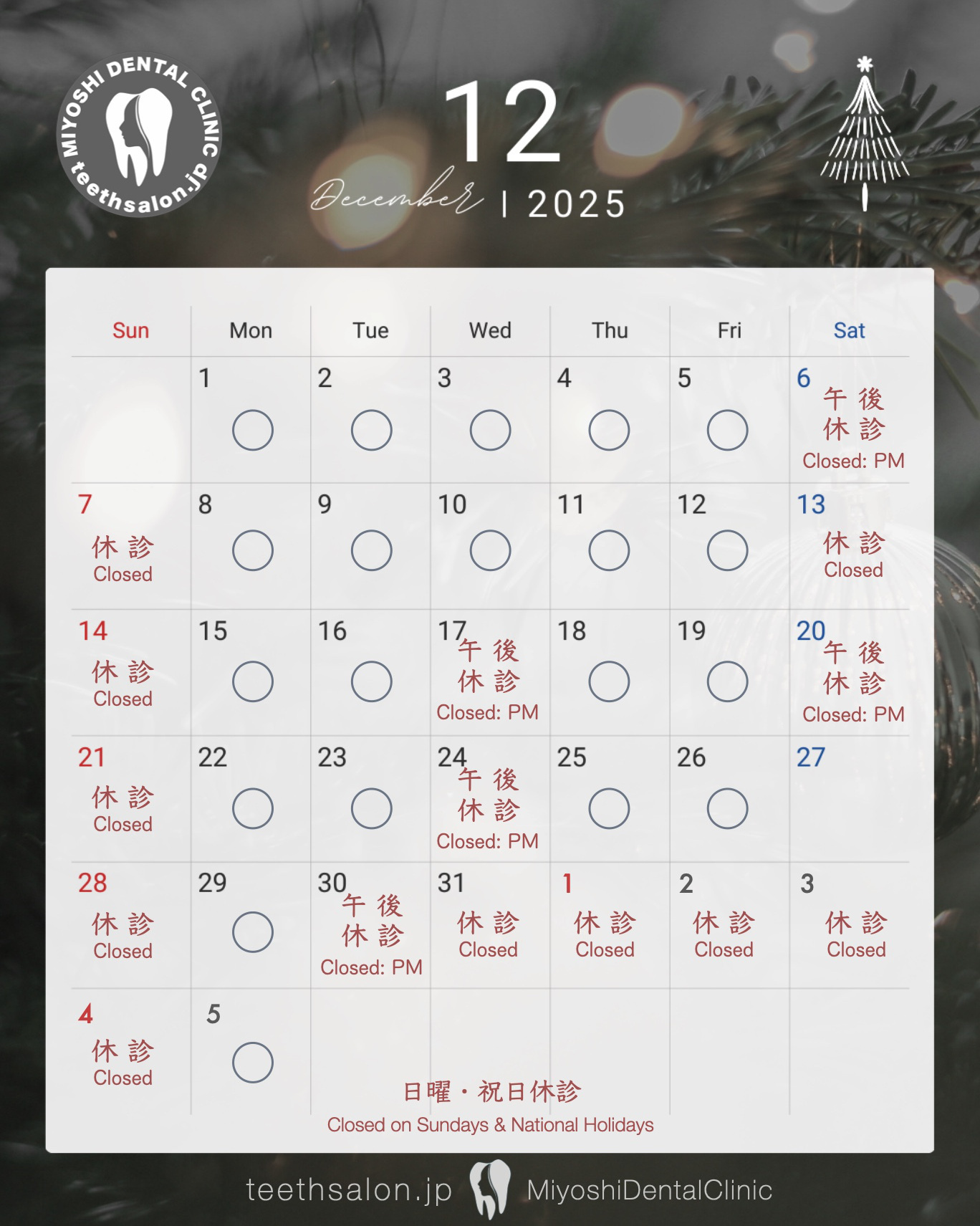 12月30日(火)午後〜1月4日(日)まで休診、5日(月)より通常診療となりますのでよろしくお願いします。