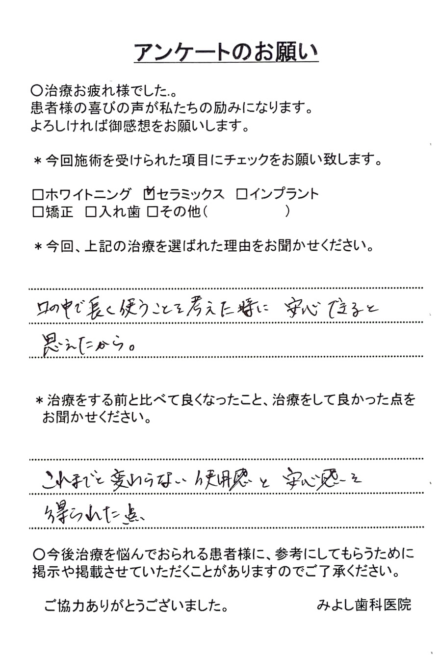 この写真は奥から2番目にセラミックス治療をしました。一番奥は同時にコンポジットレジン(白い詰め物)治療をしています。右側の写真は治療して3年後の写真ですがセラミックスはレジンに比べ色の変化や着色がなく、光沢があり自然な感じで美しさを保っています。