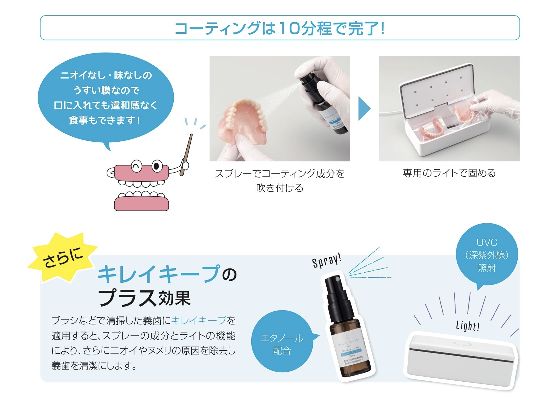 キレイキープは、無色透明のコーティングで入れ歯の手入れが楽になります。