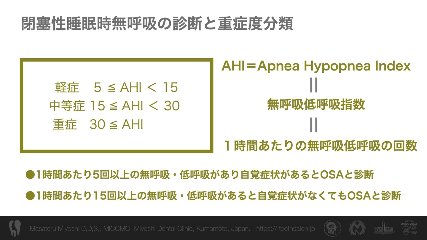1時間あたり5回以上の無呼吸·低呼吸があり自覚症状があるとOSAと診断されます。また、1時間あたり15回以上の無呼吸·低呼吸があると自覚症状がなくてもOSAと診断されます。