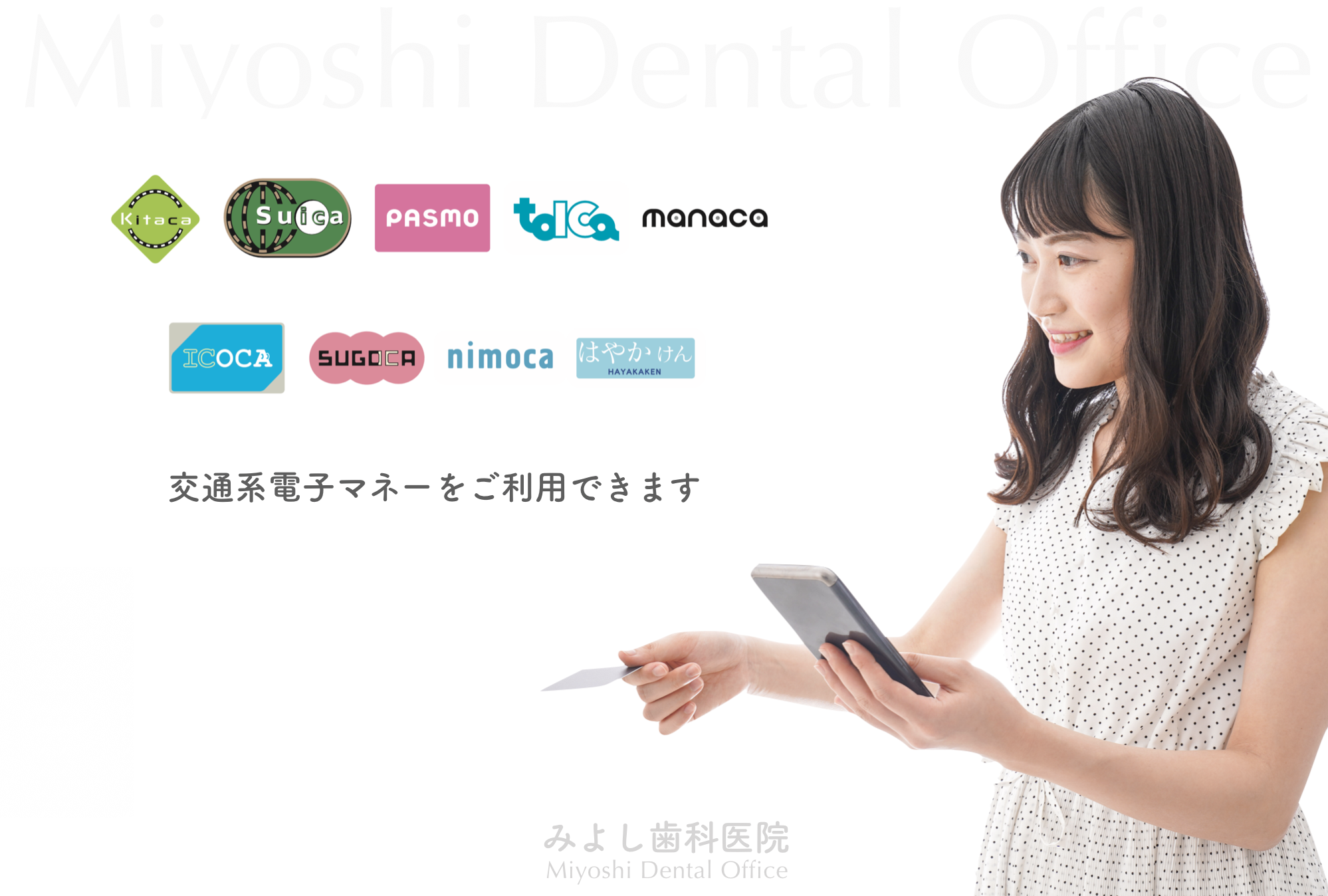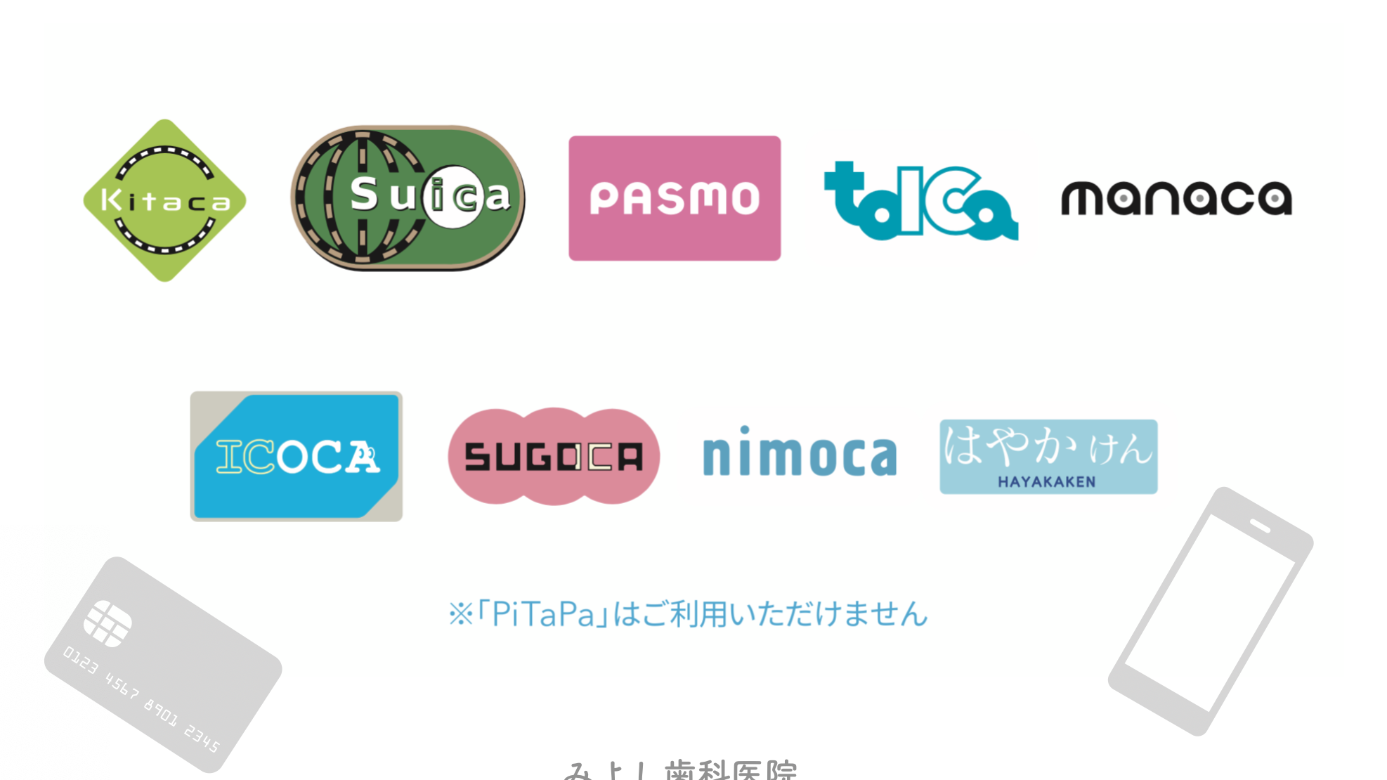 みよし歯科医院でのお支払いに、Kitaca、Suica、PASMO、tolCa、manaca、ICOCA、SUGOCA、nimoca、はやかけん などの各種交通系ICカードをご使用できます。受付にてカードをかざしてお支払いしていただきます。