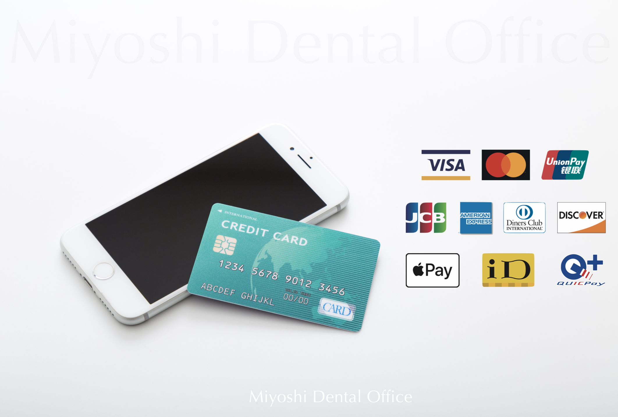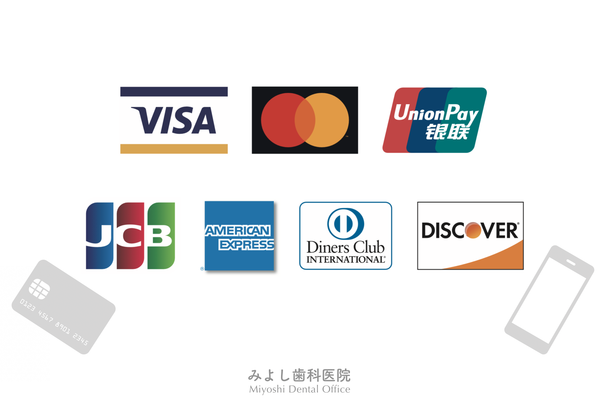 みよし歯科医院でのお支払いに使用できるクレジットカードはVISA、MasterCard、JCB、AMEX、Diners Club、DISCOVER、Union Payです。