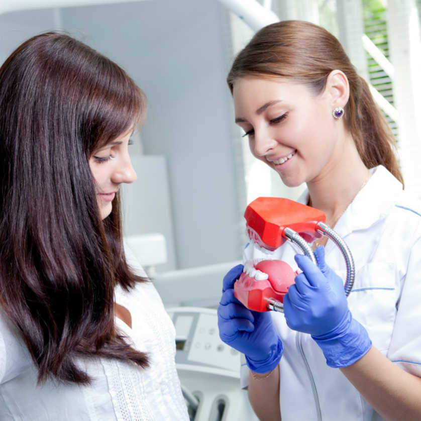 歯に詰めたりかぶせたりする虫歯治療、歯ぐきの検査や歯石とりを行う歯周病治療、入れ歯やかぶせ歯などの治療の他、歯磨き指導、知覚過敏の治療、 かみ合わせや歯ぎしり、顎関節症の治療などを行います。