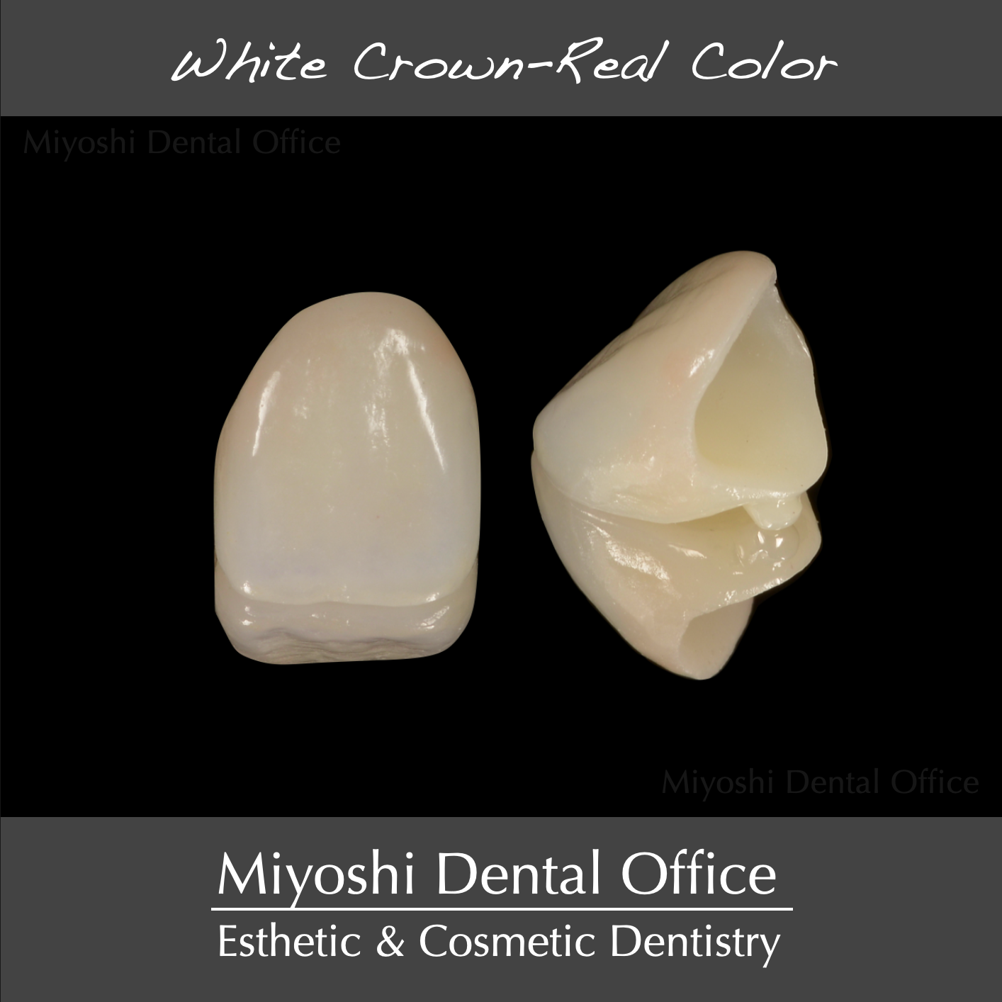 強度と色調に優れるジルコニアにご自分の歯の色に合わせて着色してあります。硬くてきれいなのが特徴です。 透明感は上記のものには劣りますが、丈夫で色・光沢が変わらない白い歯をお望みの方におすすめです。