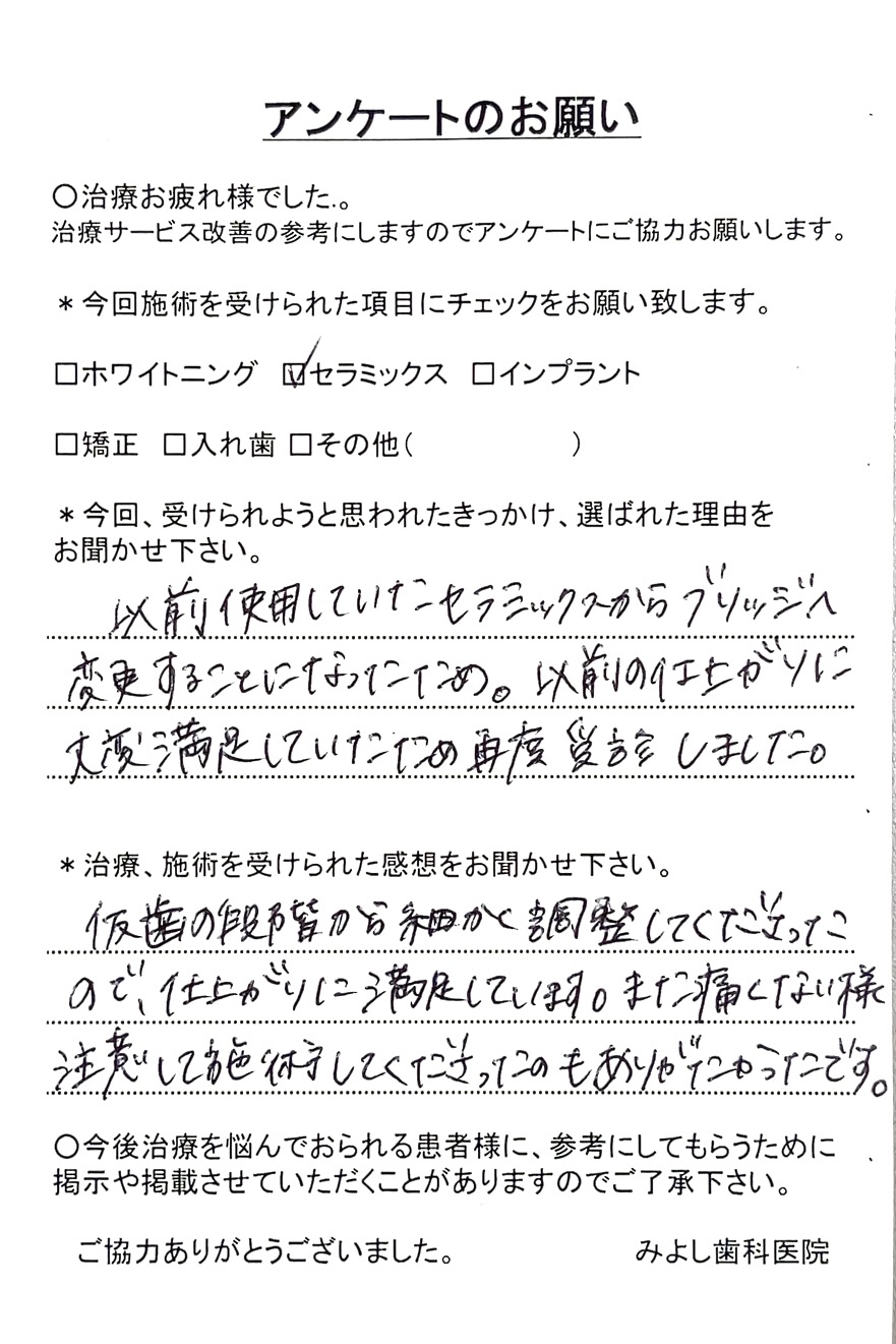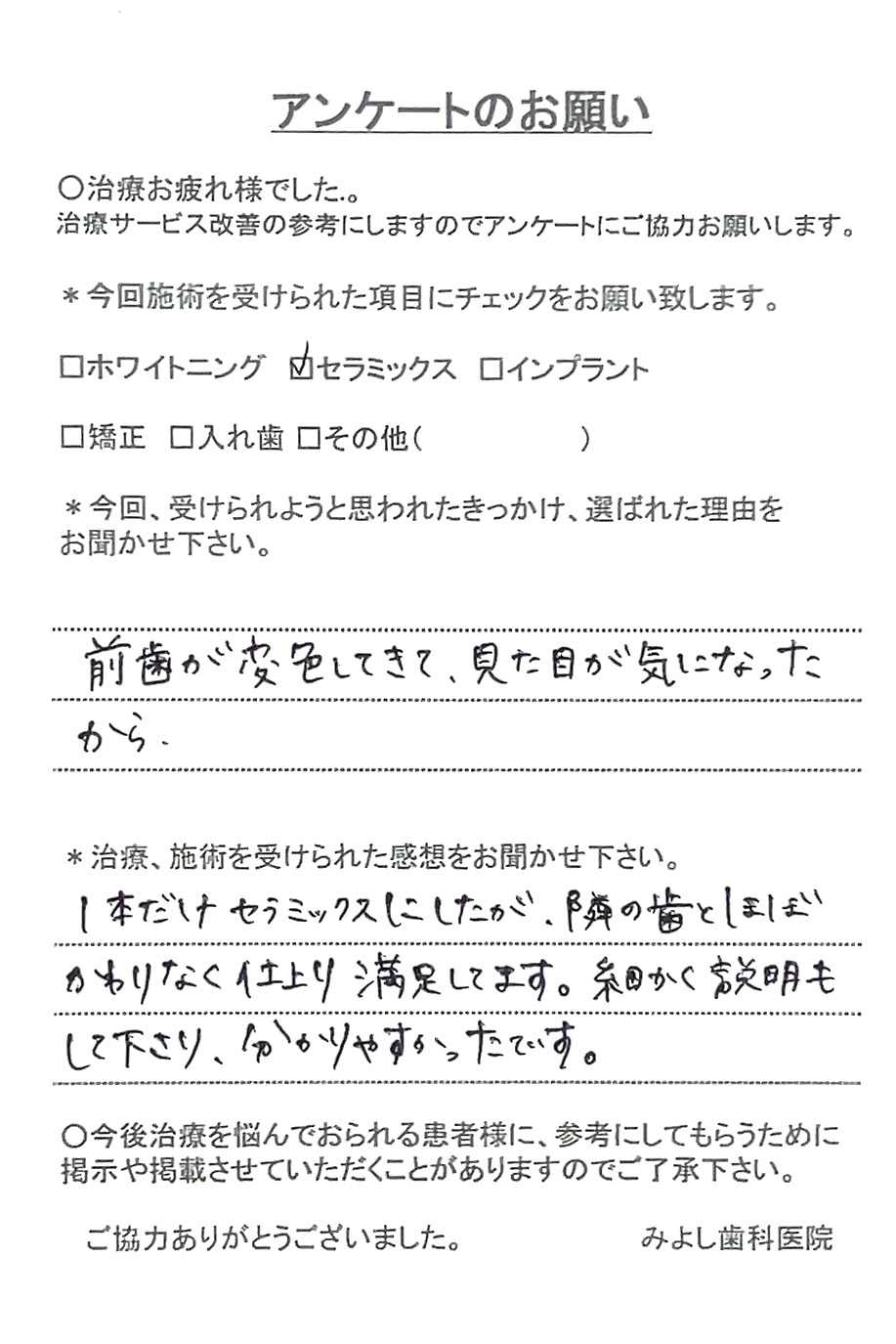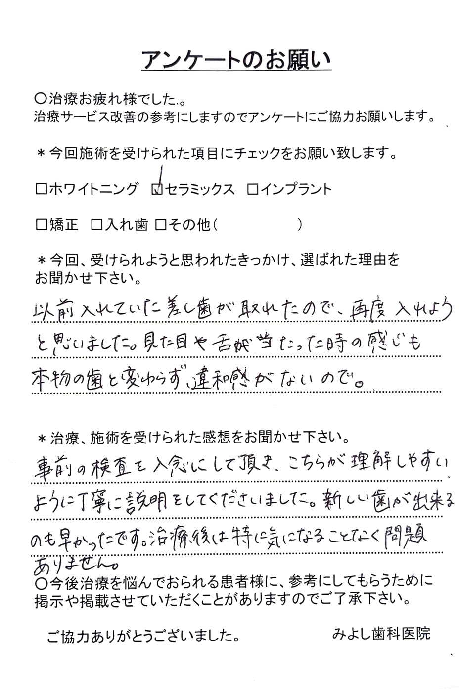 この写真は奥から2番目にセラミックス治療をしました。一番奥は同時にコンポジットレジン(白い詰め物)治療をしています。右側の写真は治療して3年後の写真ですがセラミックスはレジンに比べ色の変化や着色がなく、光沢があり自然な感じで美しさを保っています。