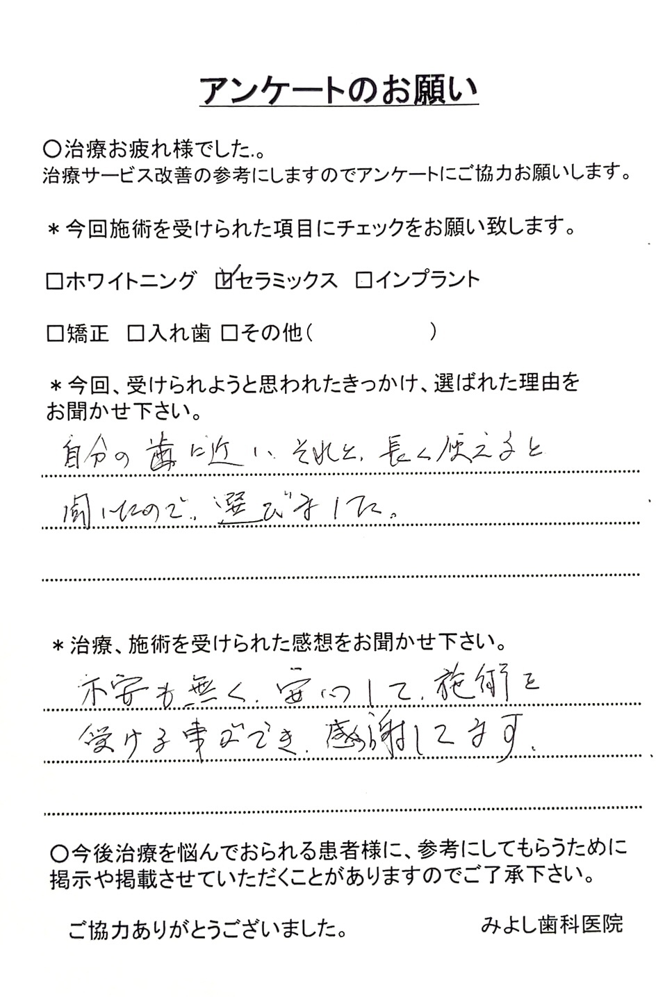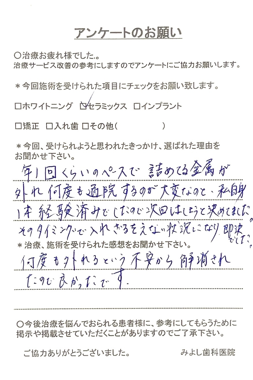 金属は見た目も悪く、体の中に蓄積したり金属アレルギーの原因にもなりますが、セラミックスはそんな心配もなく長期的に色や光沢が持続して美しく自然な状態が維持できるので歯科関係者も含め多くの方に選ばれています。