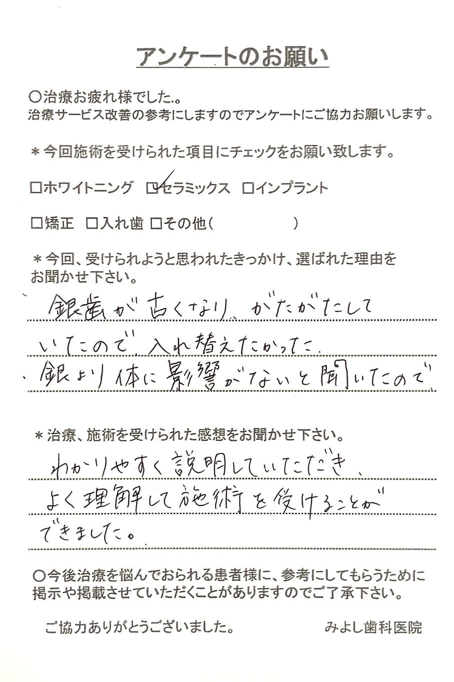 最近、笑ったり話をする時や写真に写る時に口の中にギラギラした金属が見えるのを嫌がる方が増えてきました。また、直接体につけるものなので、自然に見えて体に優しい材料が美意識の高い方や健康志向の方に好まれています。