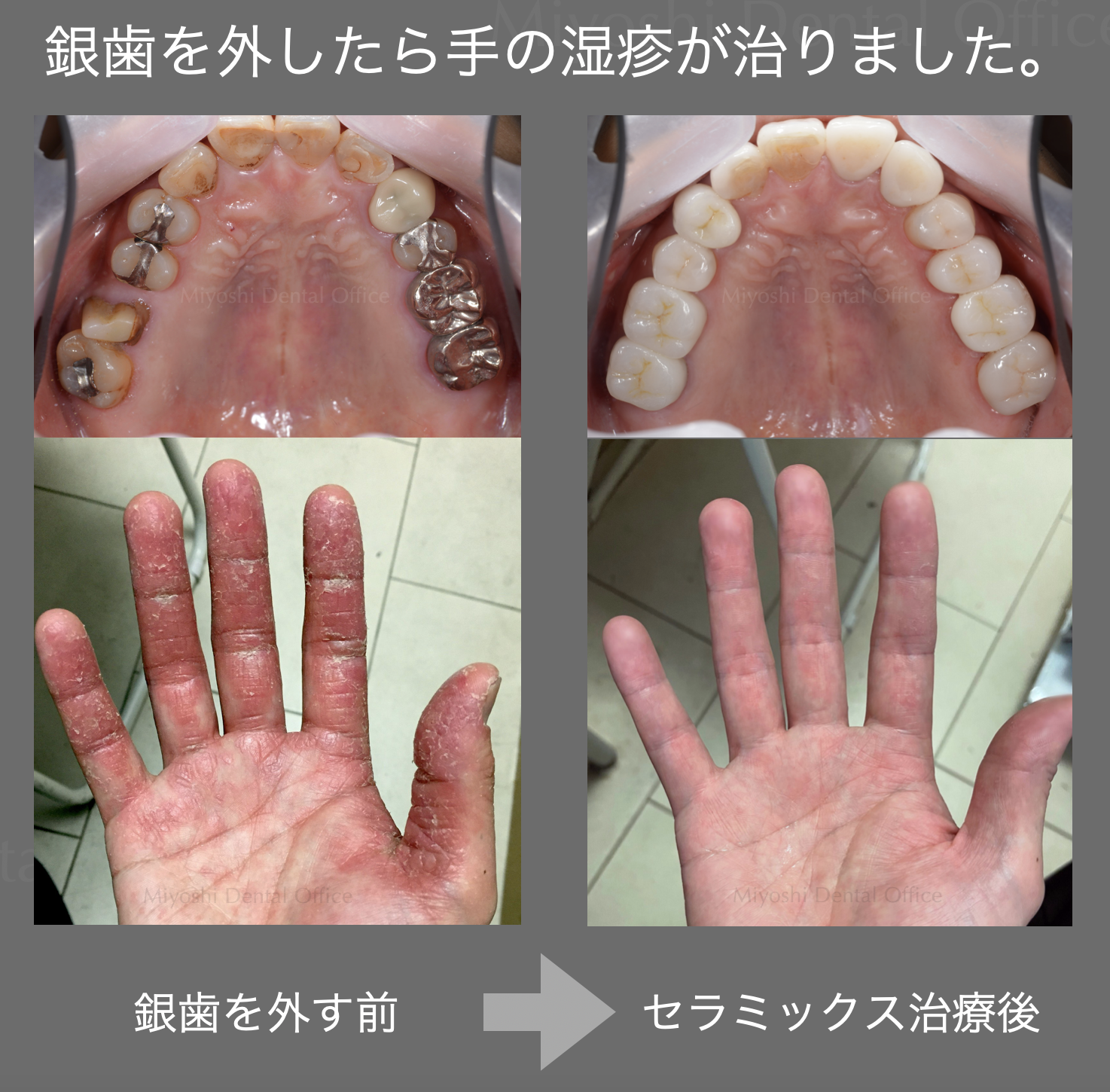院長の私も恥ずかしながら以前は銀歯を入れていました。銀歯を入れていた時は手のひらの湿疹にずっと悩まされ続けてきましたが、口の中の銀歯を全て外してセラミックスに入れ換えたら、驚くほどに湿疹が治りました。(写真は実際の私の歯と手の写真です)