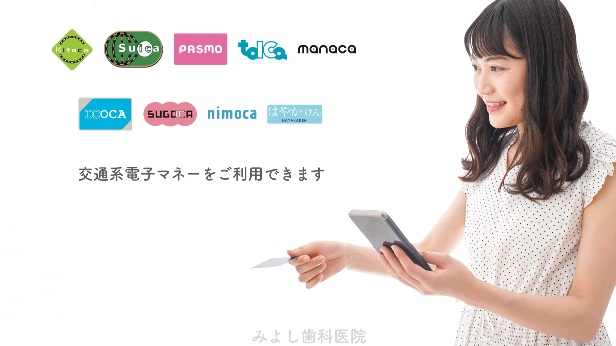 みよし歯科医院でのお支払いに、Kitaca、Suica、PASMO、tolCa、manaca、ICOCA、SUGOCA、nimoca、はやかけん などの各種交通系ICカードをご使用できます。Suicaはおサイフケータイ対応のスマートフォンやiPhoneを使って『モバイルSuica』として利用できます。